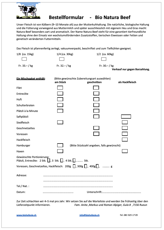 Unser Fleisch ist von Kälbern (9–10 Monate alt) aus der Mutterkuhhaltung. Die natürliche, biologische Haltung und die Fütterung vorwiegend aus Muttermilch und später ausschliesslich mit eigenem Heu und Gras macht Natura-Beef besonders zart und aromatisch. Der Name Natura Beef steht für eine garantiert tierfreundliche Haltung ohne den Einsatz von wachstumsfördernden Zusatzstoffen, tierischen Eiweissen oder Fetten und genetisch veränderten Futtermitteln.