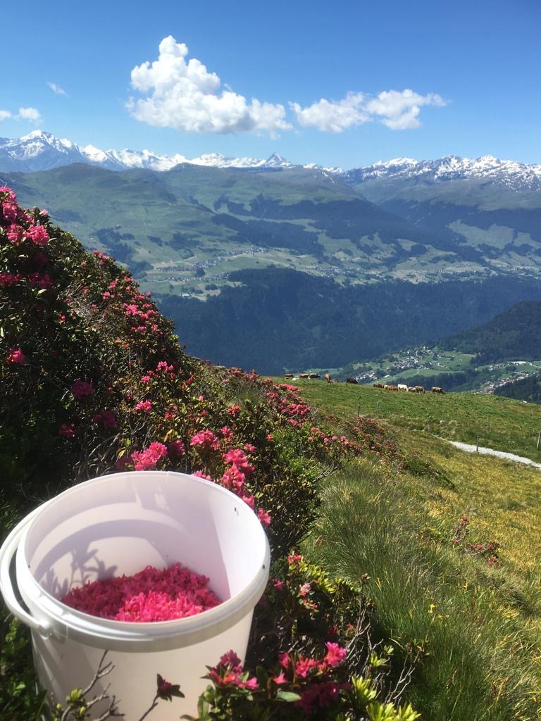 Nicht fehlen darf in unseren Gestellen der beliebte Alpenrosen-Gelee. Die Alpenrosen werden jeweils im Sommer auf unser Alp Rueun gepflückt und zum beliebten Alpenrosen-Gelee verarbeitet.