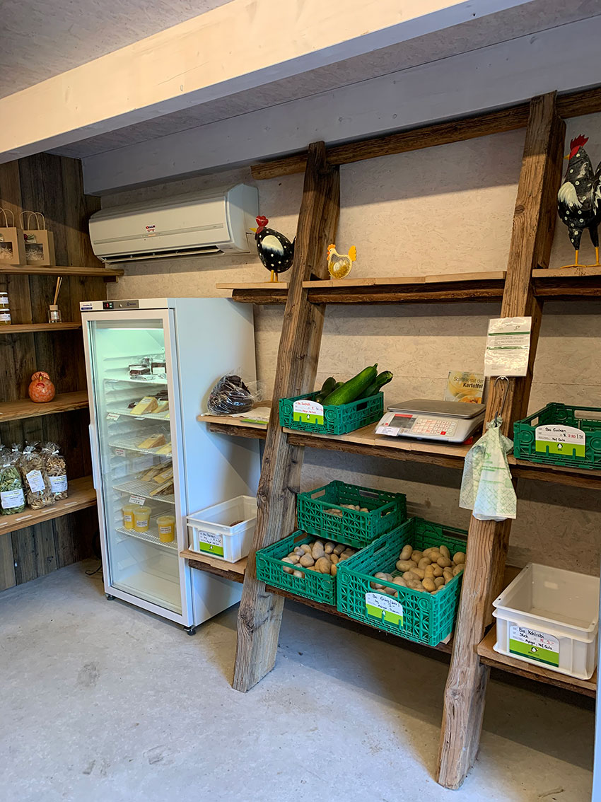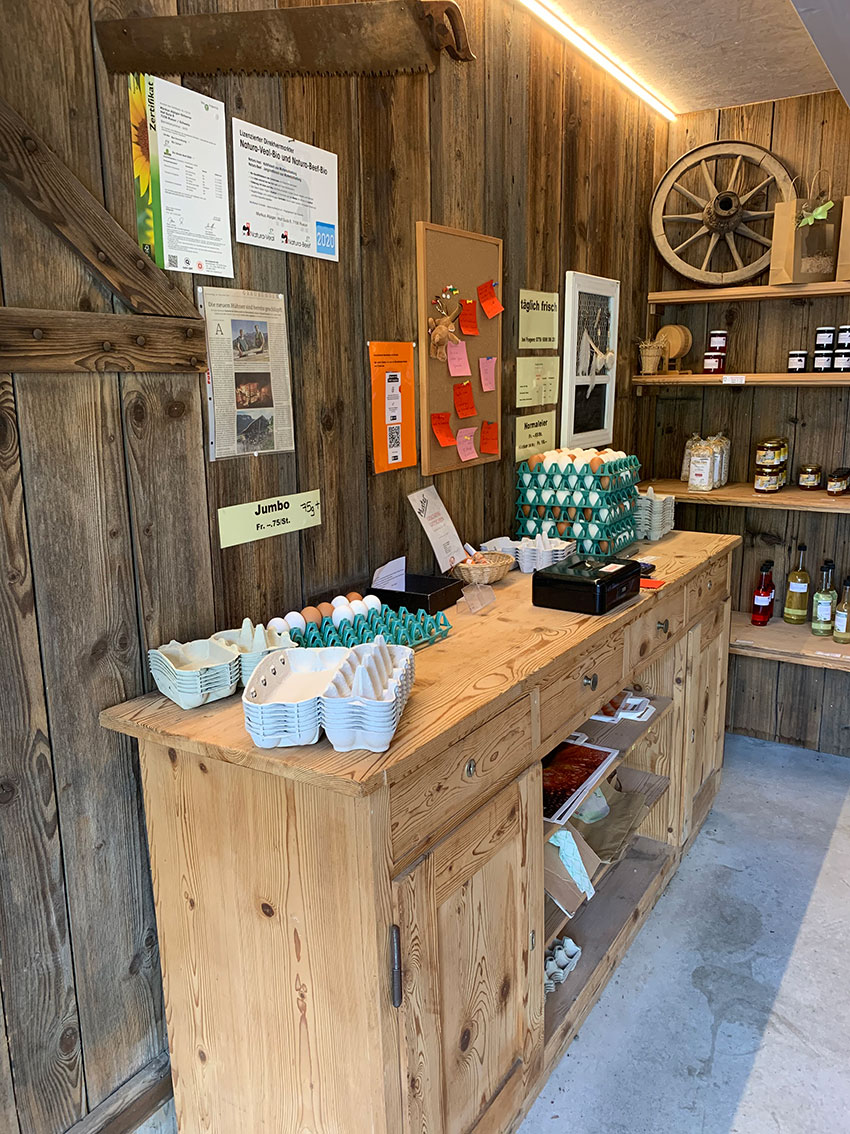 Im liebevoll eingerichteten Hofladen des Biohofs Gula finden sich viele selbst hergestellte Produkte. Nebst Eiern, Fleisch, Gemüse und Früchte erfreut sich unsere Kundschaft auch an verschiedenen Konfitüren, Sirupen, Süss-Saures, Gebäck, Röteli, Eierlikör ....